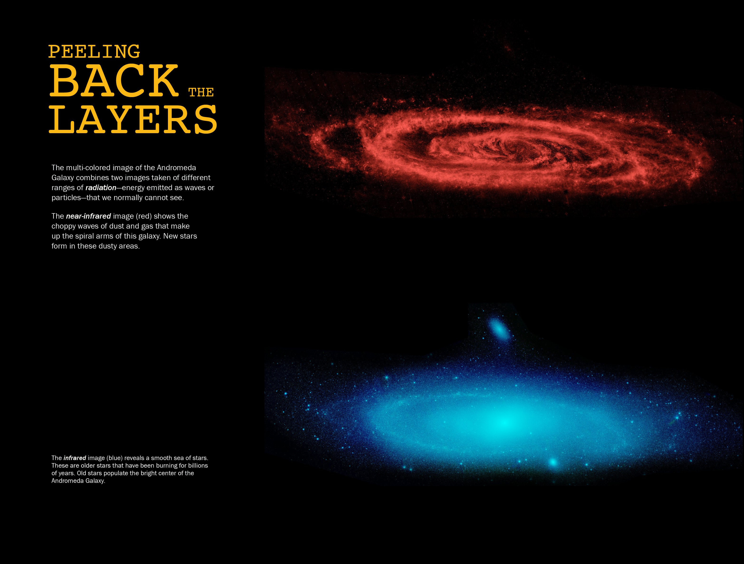 The multi-colored image of the Andromeda Galaxy combines two images taken of different ranges of radiation—energy emitted as waves or particles—that we normally cannot see.